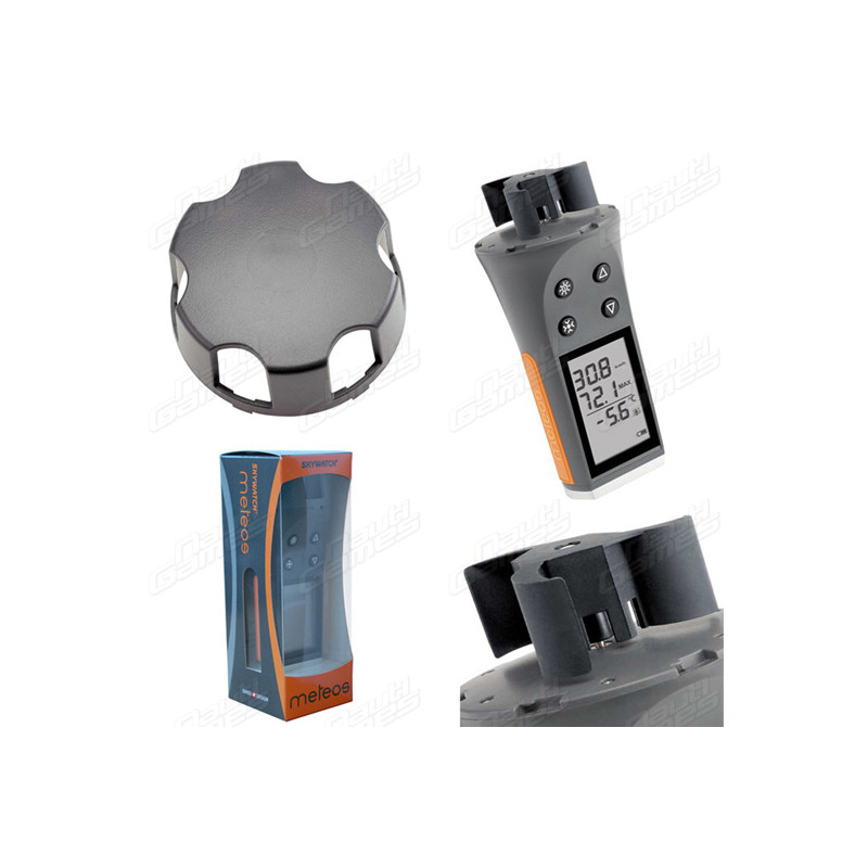 Le SKYWATCH meteos est un anémomètre-thermomètre qui mesure avec précision la force du vent sans se soucier de sa direction. Le SKYWATCH meteos est alimenté en énergie par deux piles LR6 remplaçables. L?affichage s?effectue au dixième d?unité jusqu?à 99.9, ensuite à l?unité.