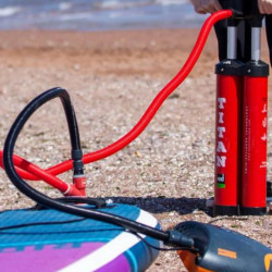L'adaptateur multi-pompe de Red Paddle permet de connecter deux pompes sur le même paddle et pouvoir allier une pompe électrique et manuelle par exemple. Il suffira de le fixer sur la valve et de brancher vos pompes. Les deux clapets anti-retour permettent de l'enlever sans que l'air ne s'échappe.