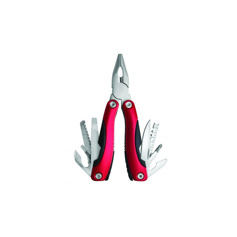 Fabriqué en acier inoxydable ce couteau comprend 14 fonctions: pince, lame à fil, lame dentée, ouvre-boîtes, poinçon, scie à bois, tournevis cruciforme, 3 tailles de tournevis plats, lime, dénude-fils, mètre et une fonction de mise en sécurité.