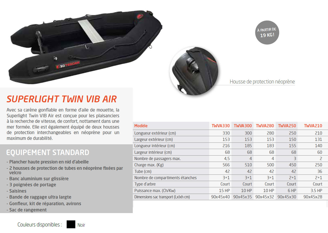 Avec sa carène gonflable en forme d’aile de mouette, la Superlight Twin VIB Air est conçue pour les plaisanciers à la recherche de vitesse, de confort, nottament dans une mer formée.