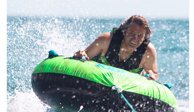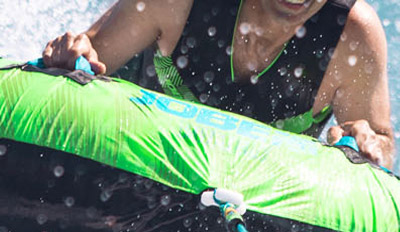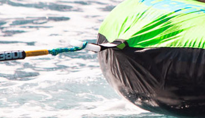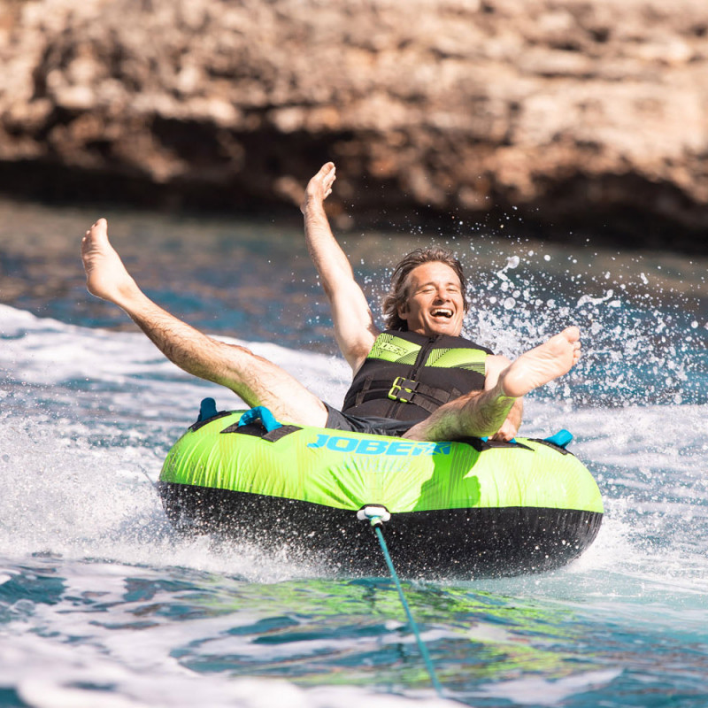 La bouée de traction Rumble est prévue pour un usage en solo assise ou à plat ventre. Tous les accessoires sont offert : gonfleur électrique, corde de traction, drapeau de sécurité, attache quick connect.