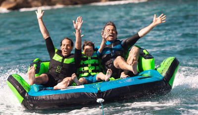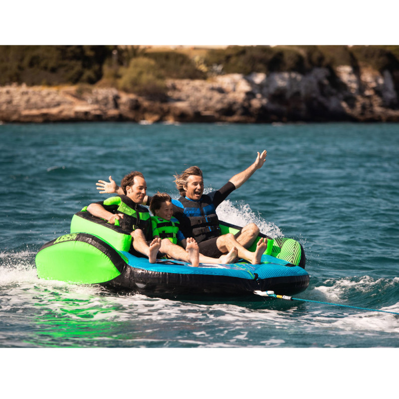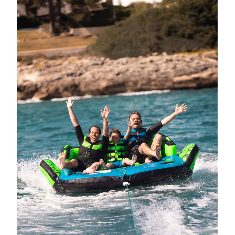 La bouée tractable Lunar est adaptée pour 3 personnes. Elle peut être tractée des deux sens, pour être soit assis en position fauteuil, ou sur les genoux !