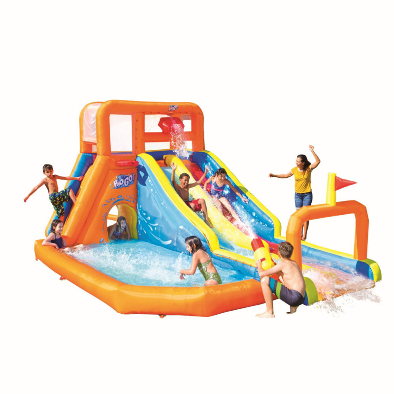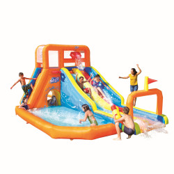 Le Méga Parc Aquatique Sommet Des Vagues Tsunami est parfait pour les groupes d'enfants, fêtes, anniversaires, etc... Le parc est équipé de 2 toboggans, d'un grand pistolet à eau intégré, d'un espace pisicne, d'un tunnel et d'un anneau à balles.