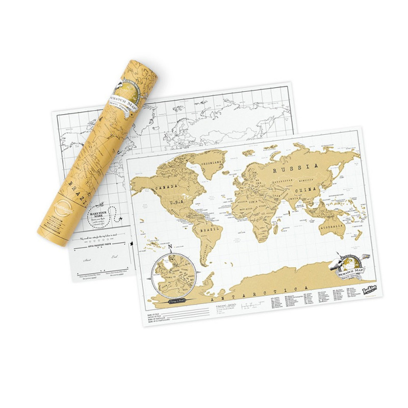 A emporter partout avec vous, cette carte du monde illustrée en blanc et dorée vous permettra de suivre pas à pas votre périple à travers le globe !