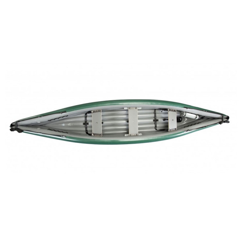 Canoë gumotex, banquette bois x3, système d'auto vidage, sac de rangement, ligne de vie, kit de réparation, embout de gonflage.