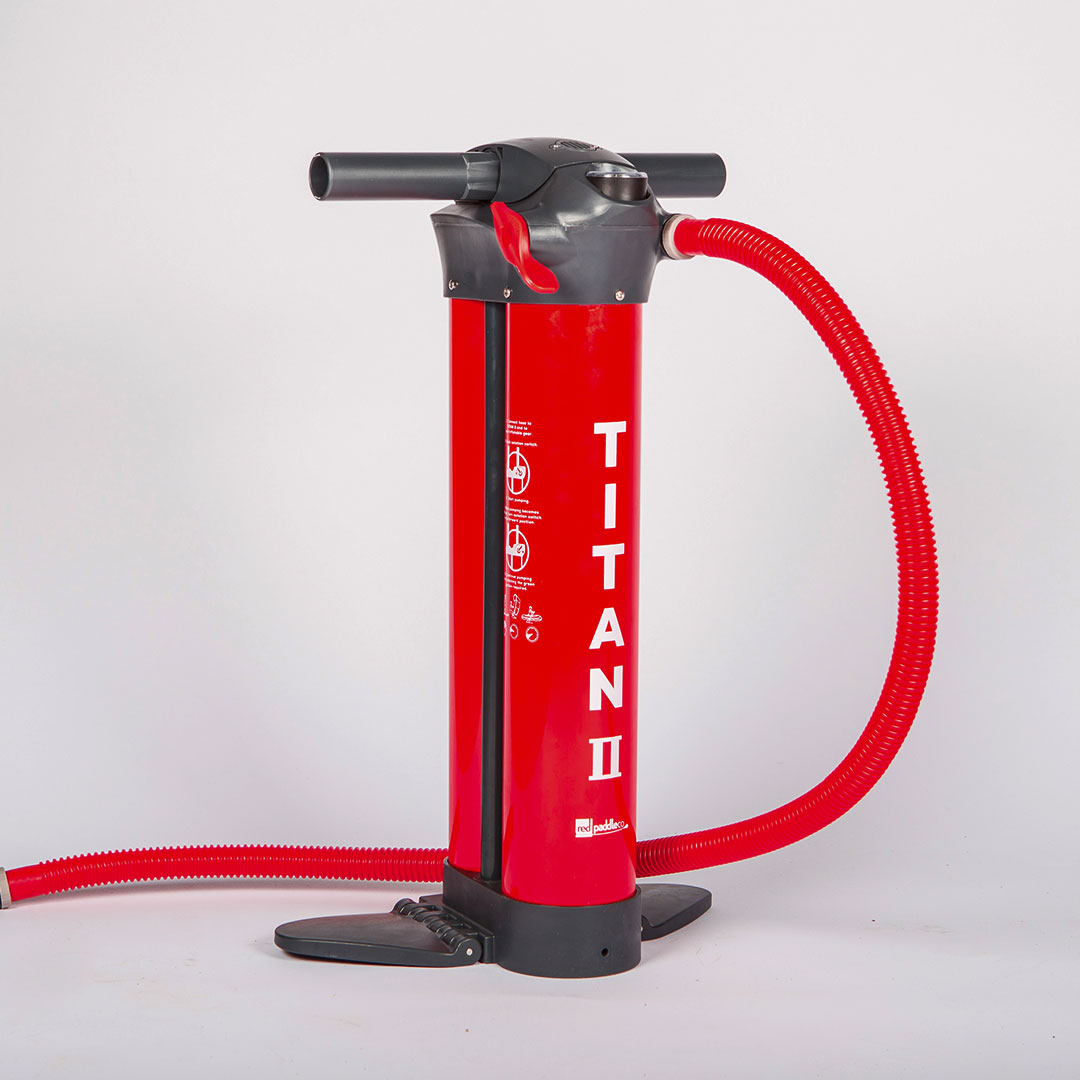 Pompe Titan II ! Fournie avec tous nos packs SUP. Notre pompe Titan II, récemment perfectionnée pour toujours être à la pointe de l’industrie, vous permet de passer d’une planche bien rangée dans son sac à totalement gonflée en moitié moins de temps et d’efforts. Découvrez toutes les nouveautés apportées par la pompe Titan II ici.
