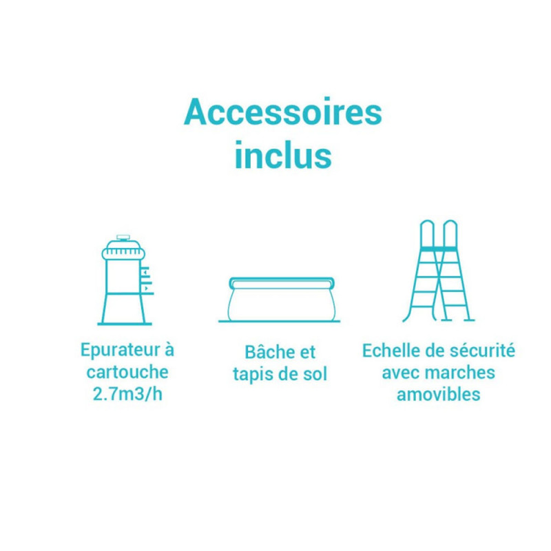 Livrée complète avec échelle, tapis de sol, bâche, épurateur 2,7 m³/h et ses tuyaux