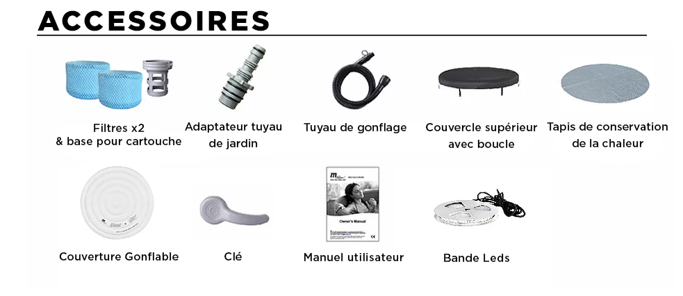 Livré complet avec 2 filtres, 1 base pour cartouche, 1 adaptateur pour tuyau de jardin, 1 tuyau de gonflage avec manomètre, 1 couvercle supérieur avec boucle, 1 tapis de conservation de chaleur, 1 couverture gonflable, 1 clé, 1 bande leds et 1 manuel d'utilisation,