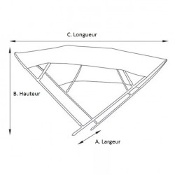 - Longueur : Il s'agit de la longueur dépliée, à vous de choisir quelle partie du bateau vous souhaitez couvrir. Les embouts femelles encastrés sur le bateau sont situées à la moitié de la longueur. Il faut imaginer le bimini ouvert pour voir la surface qu'il va couvrir. Sur le croquis, lettre C.