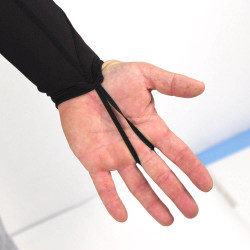 Les liens aux poignées permettent de l'accrocher aux doigts pour éviter que les manches ne remontent. Pratique !