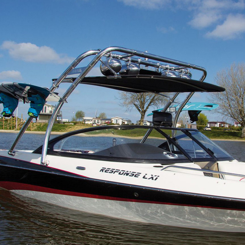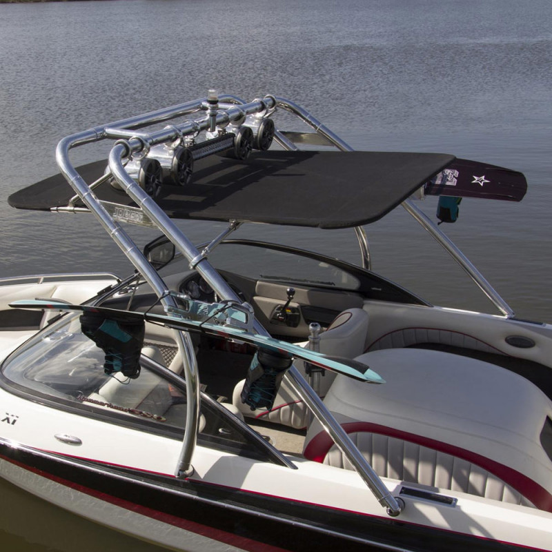 Le taud Jobe est totalement ajustable et peu glissé vers l'avant comme vers l'arrière. Le bras de support peut s'installer à la poupe, à la proue, par dessus, par dessous pour s'adapter parfaitement. La barre principale est également ajustable avec une goupille pour la verrouiller solidement. Lorsque le bateau tracte, il suffit de retirer la bâche avec les fermetures éclair et velcros et le cadre reste en position.